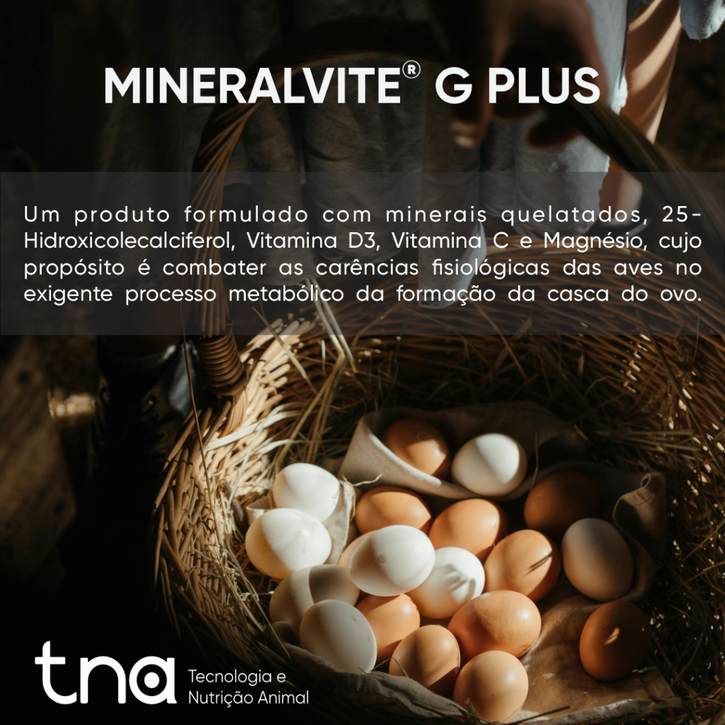 Foi nesse sentido que a TNA desenvolveu o MINERALVITE® G PLUS, um produto formulado com minerais quelatados, 25-Hidroxicolecalciferol, Vitamina D3, Vitamina C e Magnésio, cujo propósito é combater as carências fisiológicas das aves no exigente processo metabólico da formação da casca do ovo.
